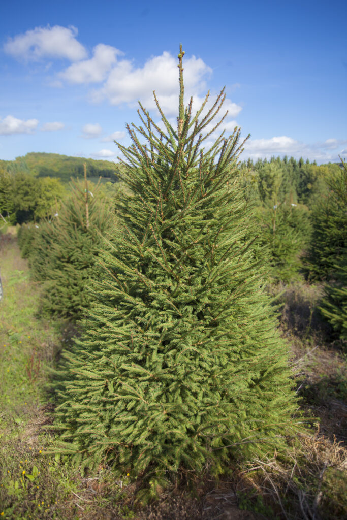 Son parfum de résine est particulièrement prononcé, créant une ambiance authentique de Noël. Cependant, il a l’inconvénient de croître lentement et reste difficile à travailler pendant sa croissance, ce qui le rend plus coûteux et moins disponible que le Nordmann. C’est un sapin qui convient particulièrement aux décorations lourdes, grâce à la solidité de ses branches.L'épicéa commun (Picea abies)